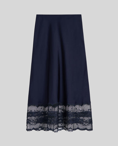 A refined silhouetteThe By Malene Birger Night Sky Blacke Skirt showcases a dark blue hue complemented by intricate lace detailing along the hem. C...