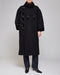 This AF Agger officer coat combines British craftsmanship with striking design elements. The black wool silhouette features a distinctive side closure with toggle fastenings along the front. The pronounced Tränas sheepskin collar creates a rich textural contrast against the smooth wool body while providing substantial warmth around the neck area.