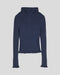 The ribbed knit construction runs throughout the hoodie, creating a textured surface that catches light at varying angles. This technique adds dimension to the navy fabric while maintaining the natural softness of Merino wool. The ribbing provides structure without stiffness, allowing the garment to drape naturally, while the ruffled edges introduce movement and visual interest that distinguish this piece within contemporary knitwear.
