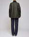 This dark green oilskin oversized jacket, featuring a brown velvet collar and pockets, is designed for both comfort and style. Ideal for various weather conditions, it provides a practical yet elegant appearance.