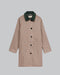 The dark green collar provides a striking contrast against the multicolored check body, creating visual interest at the neckline. This design choice frames the face and adds depth to the overall composition. The collar's solid color grounds the pattern, offering a balanced approach to the coat's distinctive aesthetic while maintaining a refined appearance.